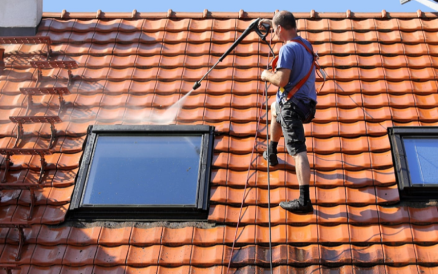 High-pressure or soft-wash roof cleaning (based on roof type)